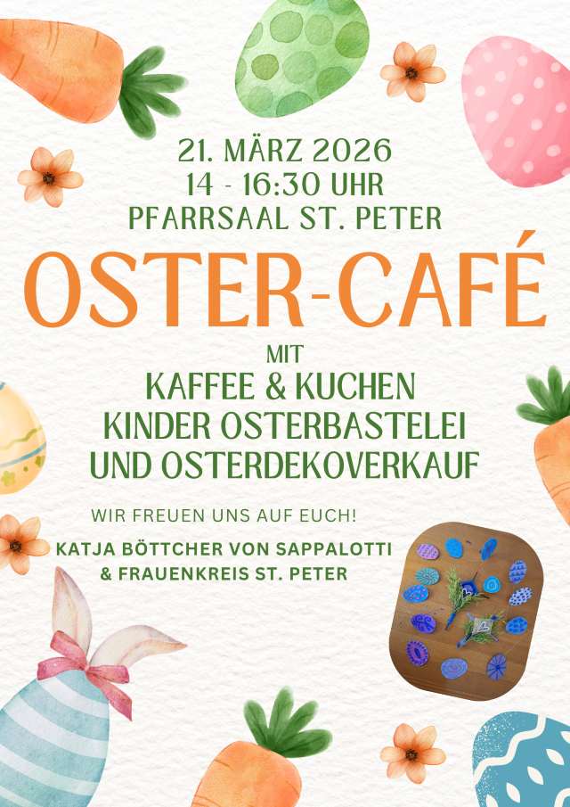 Im Pfarrsaal St. Peter findet am 21.03.2026 von 14:00 Uhr bis 16:30 Uhr ein Oster-Cafe des Frauenkreis St. Peter statt. Für die Kinder bietet Katja Böttcher von [Sappalotti] ein Bastelangebot an. Plakat und weitere Infos [hier].